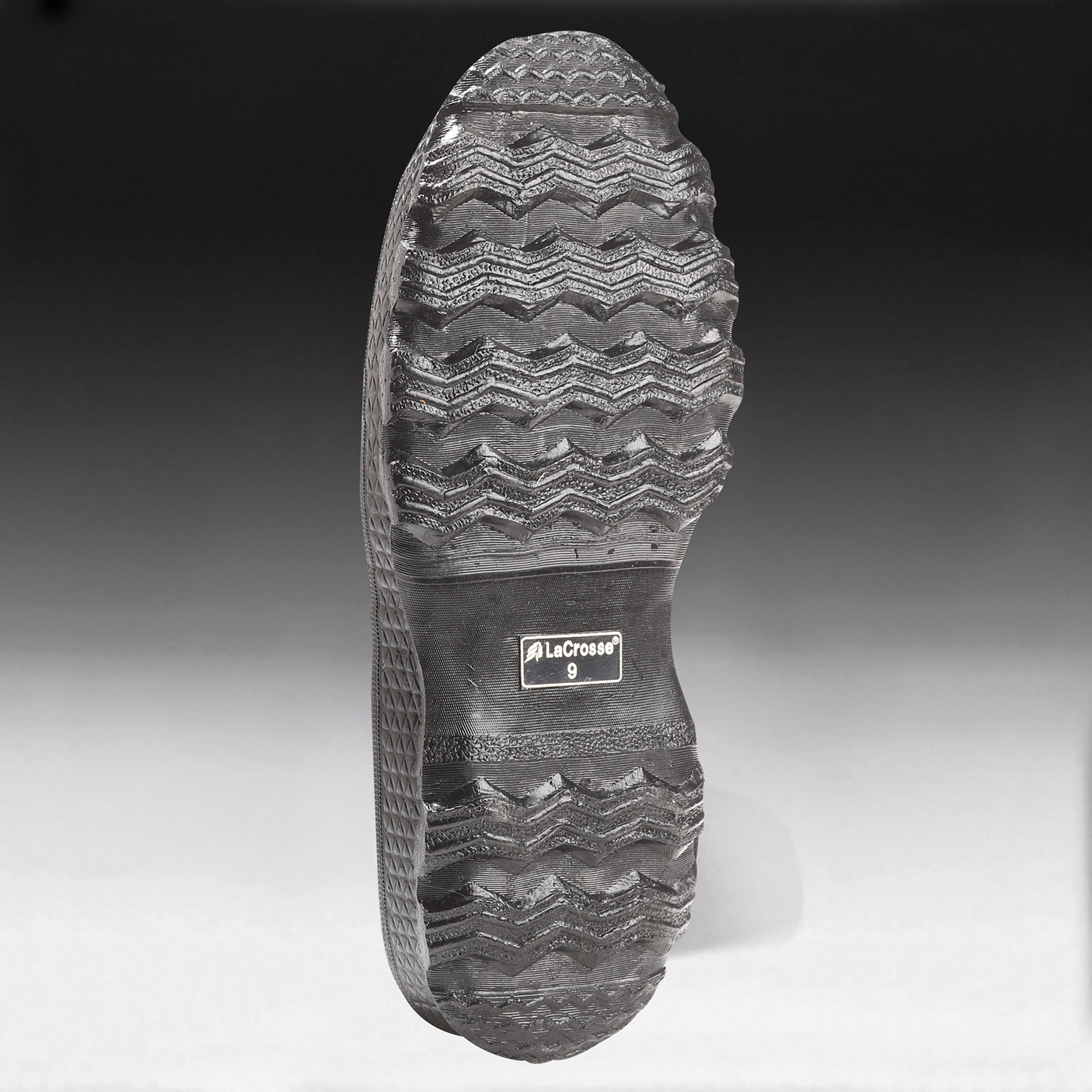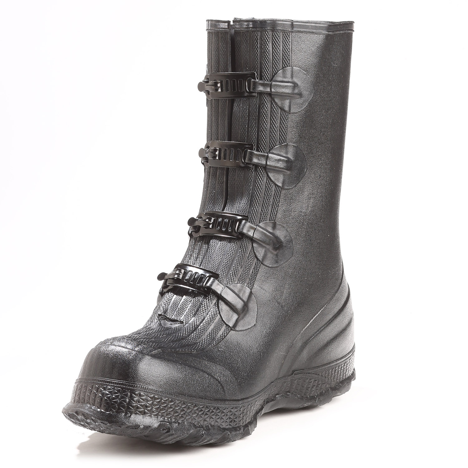 100% waterproof overshoe, lined black rubber, cleated soles. Fits over work boots.