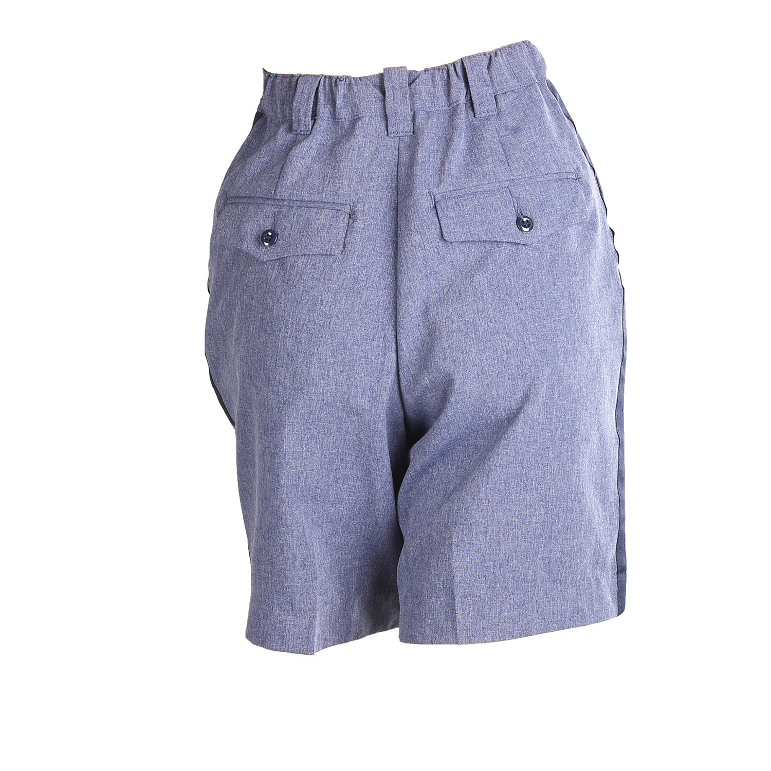 The women's walking shorts are neat and trim looking, and made of lightweight, tropical 100% woven Dacron polyester. Elastic waistband, belt loops, and front zipper. Finished knee length. Machine washable.